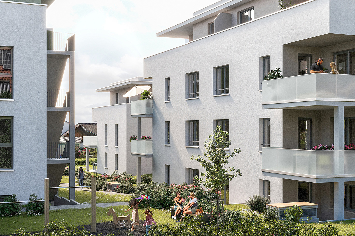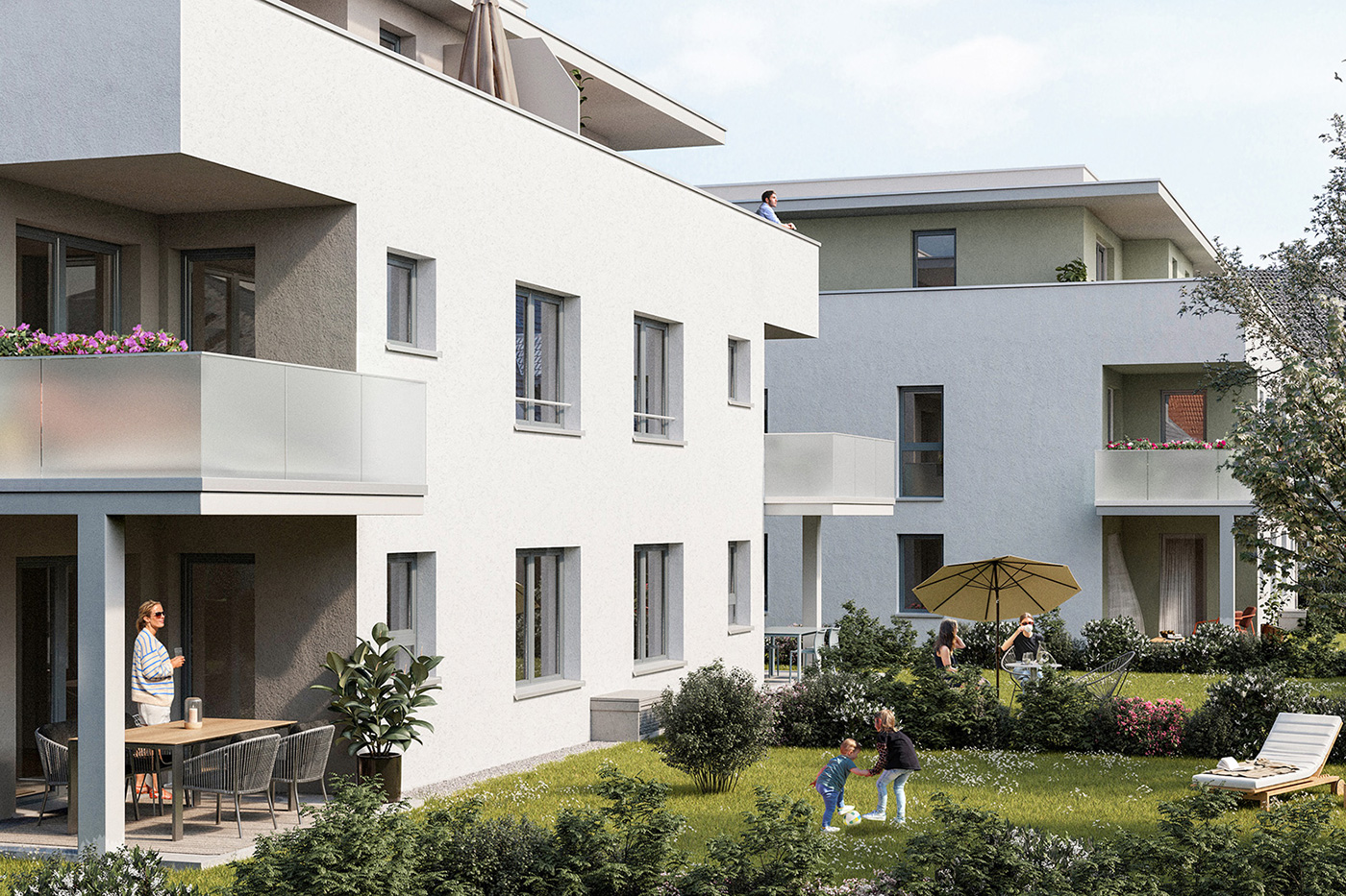 Im Außenbereich entsteht zwischen den Gebäuden ein gemeinsamer begrünter Innenhof, der neben Aufenthaltsflächen auch eine angrenzende Spielmöglichkeit für Kinder bereithält.