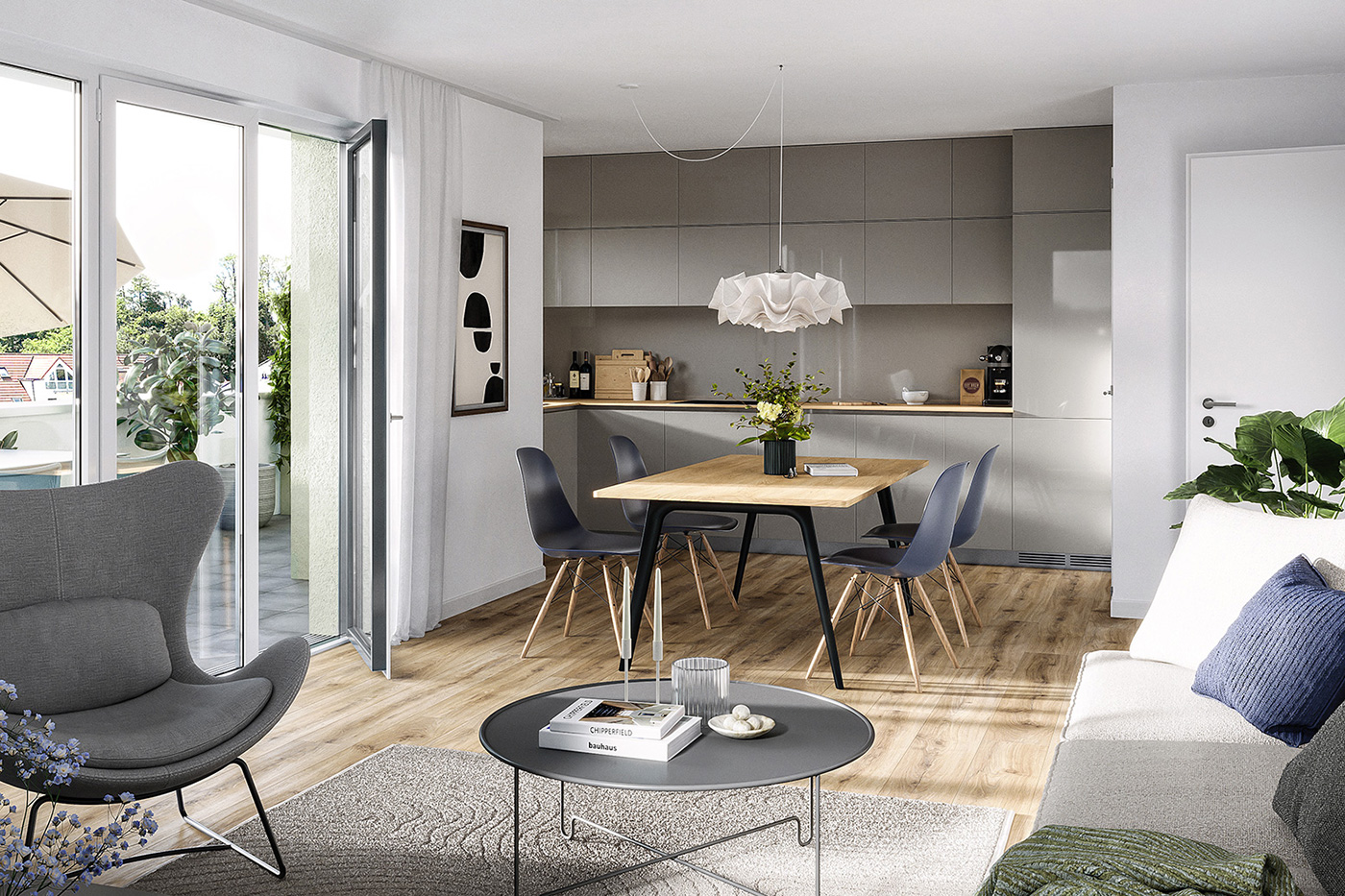 Von Parkett über hochwertiges Laminat bis Vinyl ist für jeden Wunsch etwas passendes mit dabei. Großformatige Fliesen in den Nassräumen und auf den Balkonen sowie Dachterrassen runden das moderne Gesamtbild ab.