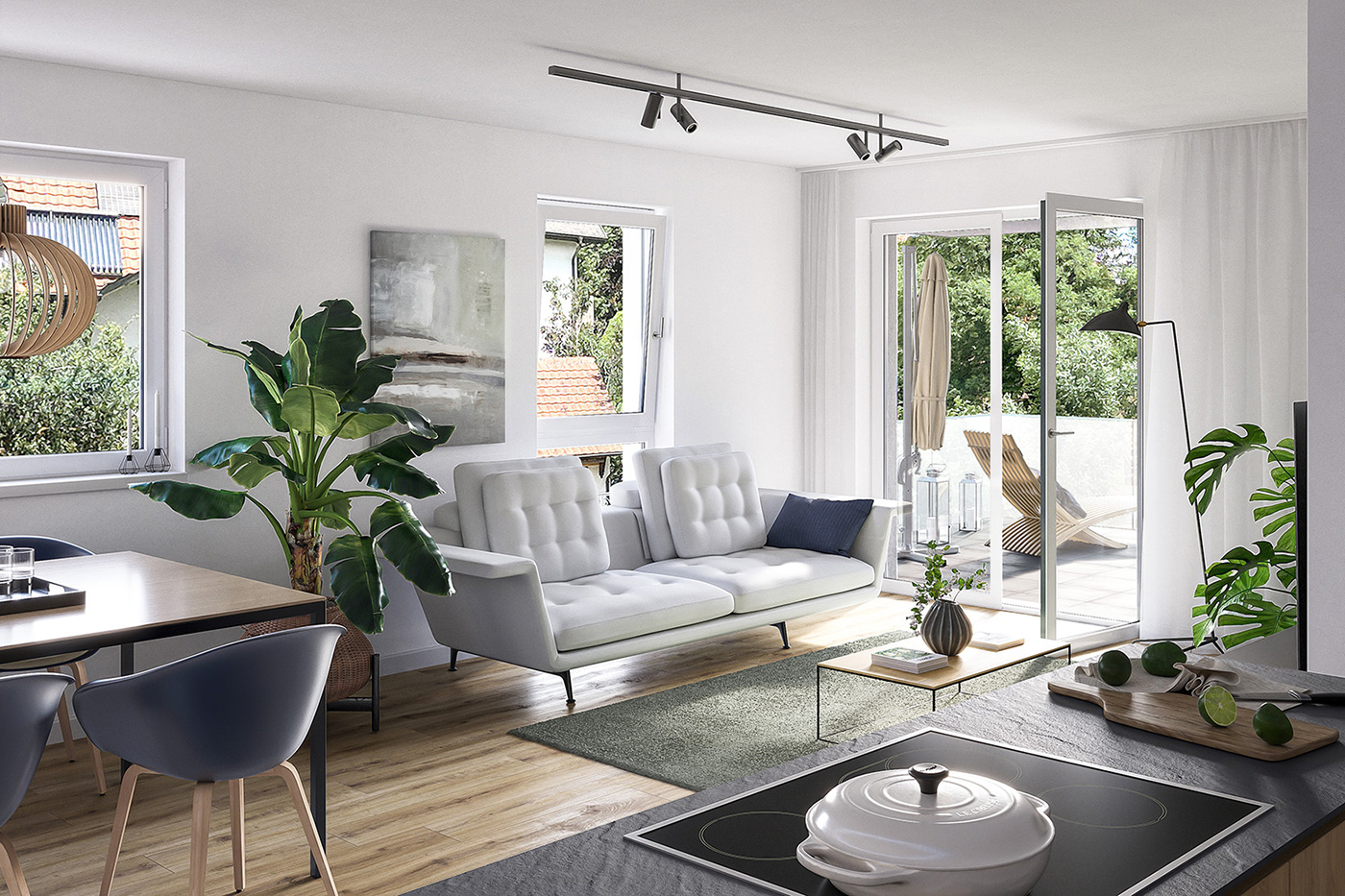 Das Angebot ist freibleibend und steht unter dem Vorbehalt der technischen Umsetzung. Sämtliche dargestellten Möblierungen, Anordnungen von Kücheneinrichtungen, Sanitärgegenstände und sonstige Einrichtungen sowie die Gestaltung und Bepflanzung der Außenanlagen in allen Illustrationen haben lediglich beispielhafte Charakter und sind nicht Bestandteil eines vertragsgegenständlichen Kaufobjekts. Gleiches gilt für eventuell dargestellte Bodenbeläge (z.B. Fliesen, Terrassen- und Balkonplatten im Hinblick auf Verlegeart, Verlegerichtung, Größe etc.).