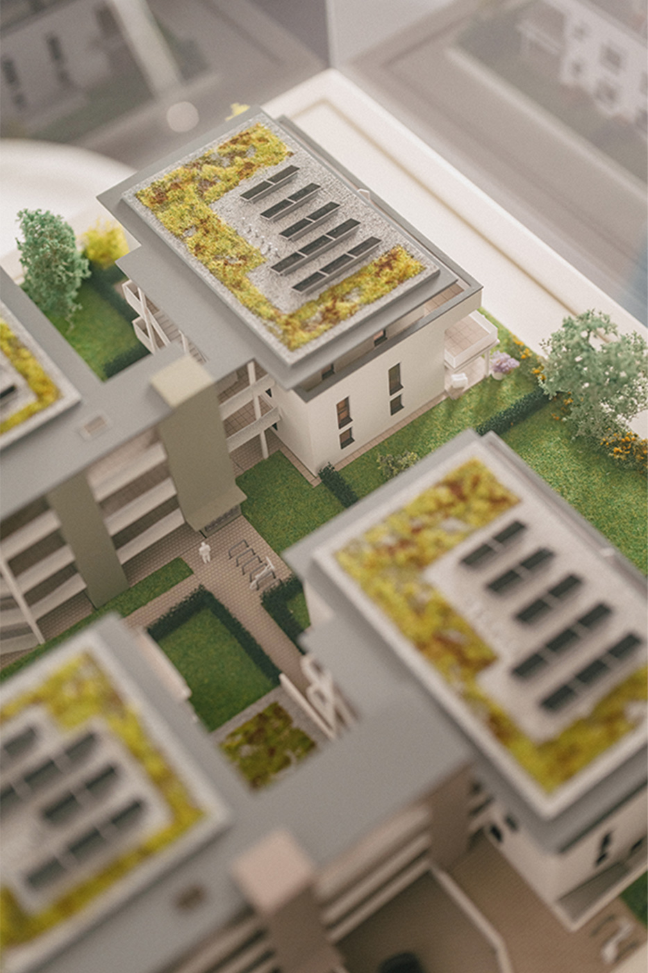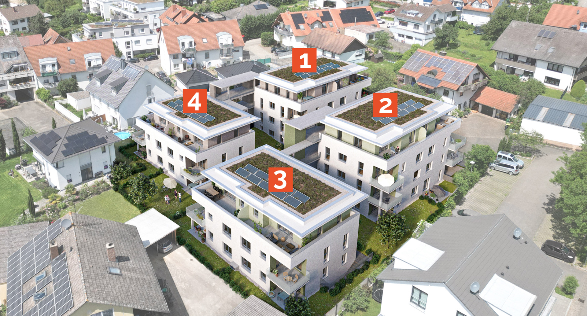 Die vier Mehrfamilienhäuser mit 28 Wohneinheiten und einer Wohnfläche zwischen 66 m² und 103 m², verteilt auf 2 bis 4-Zimmer-Wohnungen mit modernen Raumkonzepten, bieten für jeden Bedarf die passende Größe. Die Häuser sind drei- bis viergeschossig und unterirdisch über eine gemeinsame Tiefgarage für 42 Stellplätze verbunden. Über den Aufzug und die überdachten Laubengänge gelangen Sie barrierefrei von der Tiefgarage bis in das Attikageschoss.